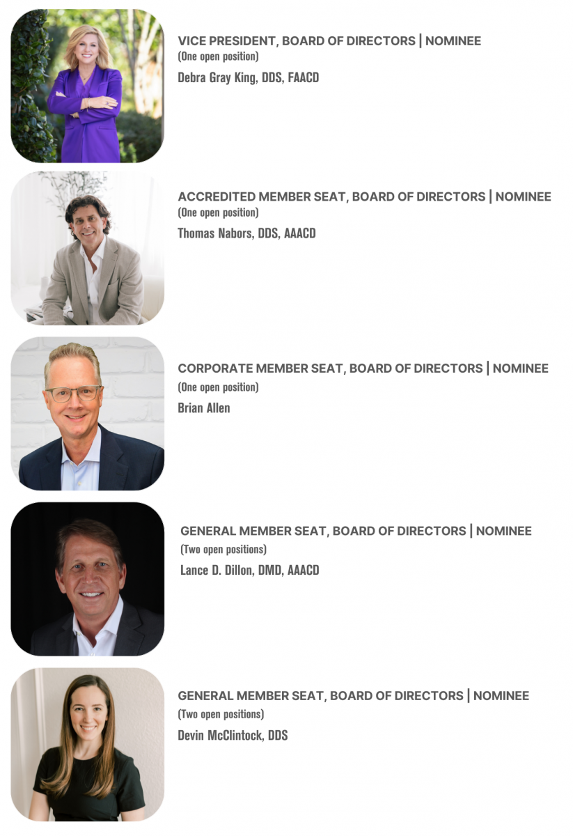 Candidate MaterialsThe committee is responsible for seeking out and encouraging future leaders for the Academy and for presenting a recommended slate of nominees to the AACD membership for the Board of Directors and the American Board of Cosmetic Dentistry. Candidates run from the floor and are not vetted by the NALDC.